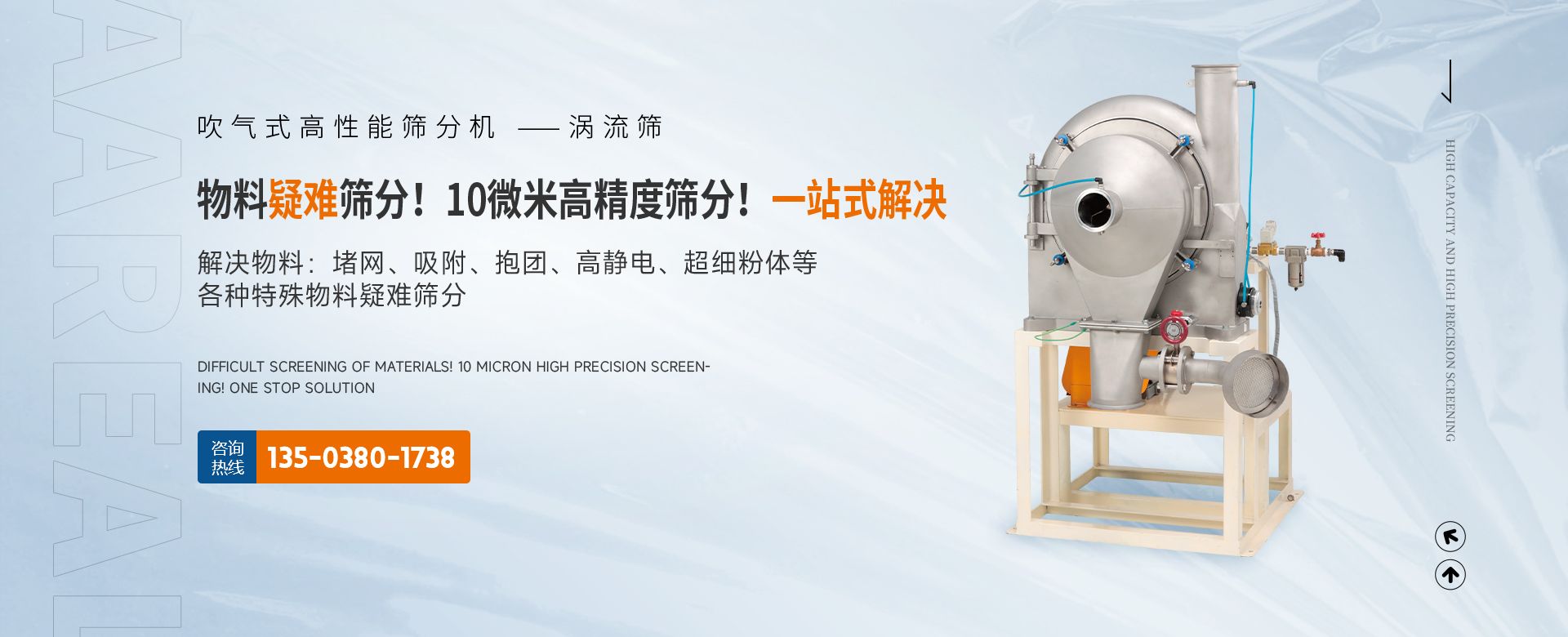 阿 瑞 爾(AAREAL)? 是從事篩分·過濾設(shè)備設(shè)計(jì)和制造的高新技術(shù)企業(yè),擁有先進(jìn)的生產(chǎn)設(shè)備、粉體篩分分析實(shí)驗(yàn)室,在中國廣州市設(shè)辦事處。祝賀:新鄉(xiāng)市超大產(chǎn)能精細(xì)篩分技術(shù)工程中心在阿瑞爾(AAREAL)成立!??!在線大產(chǎn)能篩分和在線動(dòng)態(tài)過濾是阿 瑞 爾(AAREAL)?的產(chǎn)品特點(diǎn)■ 在線大產(chǎn)能篩分,突破了傳統(tǒng)篩分觀念,工業(yè)化篩分,實(shí)現(xiàn)大產(chǎn)能、高能效篩分。以低故障率、低停機(jī)率、低使用成本、高產(chǎn)能、高精度、高能效為您帶來巨大意外收益?!?阿瑞爾(AAREAL)擁有的回轉(zhuǎn)篩分技術(shù),擁有的近百種篩分解決方案及上千種物料的篩分經(jīng)驗(yàn),會給您展現(xiàn)全新的篩分設(shè)備,幫您實(shí)現(xiàn)大產(chǎn)能篩分 高精度篩分 疑難篩分?!?阿瑞爾(AAREAL)的品質(zhì)保證:阿 瑞 爾(AAREAL)? 是高品質(zhì)篩分設(shè)備制造商高品質(zhì)是阿 瑞 爾(AAREAL)? 質(zhì)量準(zhǔn)則。優(yōu)品設(shè)備 合理篩分是阿 瑞 爾(AAREAL)?回報(bào)客戶的驗(yàn)收標(biāo)準(zhǔn)。——我們不但擁有先進(jìn)的生產(chǎn)設(shè)備,而且對于每一道工序,每一個(gè)細(xì)節(jié),我們都要精工細(xì)作。對于客戶的每一個(gè)細(xì)微的問題,我們都要認(rèn)真解決?!闹谱骱陀眯姆?wù)是我們對客戶的責(zé)任。阿瑞爾(AAREAL)是您成功道路上值得信賴的、合作伙伴,以良好的質(zhì)量、經(jīng)驗(yàn)和服務(wù)享譽(yù)多個(gè)國家,確保您安心地選擇每一件產(chǎn)品,阿瑞爾(AAREAL)竭誠與國內(nèi)外商家雙贏合作,共同發(fā)展,共創(chuàng)輝煌!阿瑞爾(AAREAL)——您正確的選擇。
